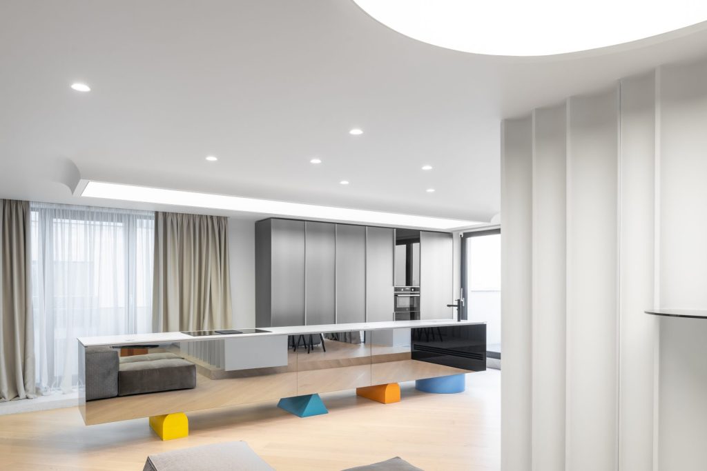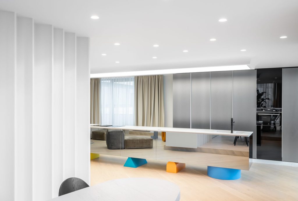 One of the most original features of the project is the geometric elements made of Kerrock material, which are placed on glass shelves. These colourful components, designed in a variety of shapes, add dynamism and a contemporary character to the space. Their flexibility allows them to blend perfectly with different design styles, while bringing a touch of playfulness and boldness.