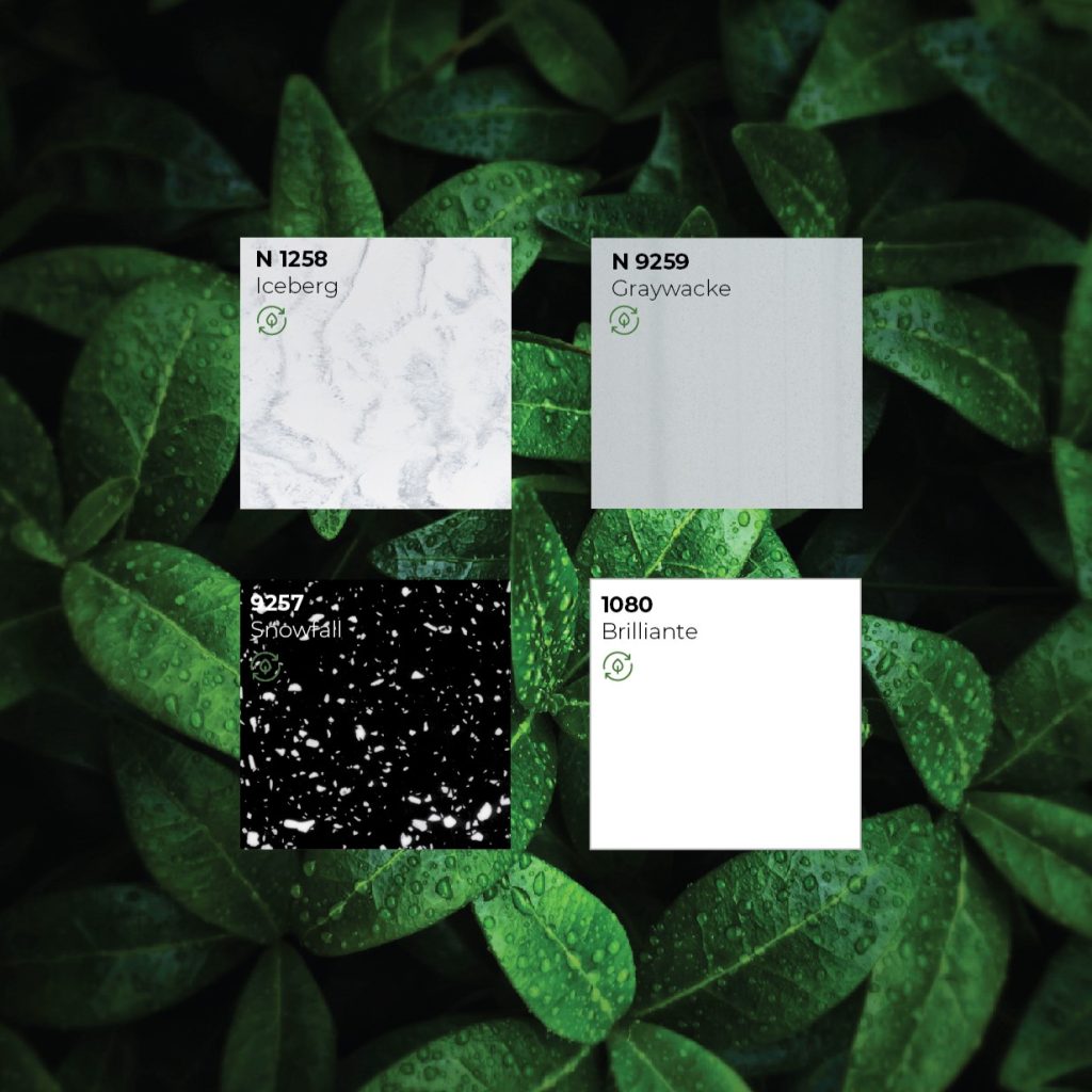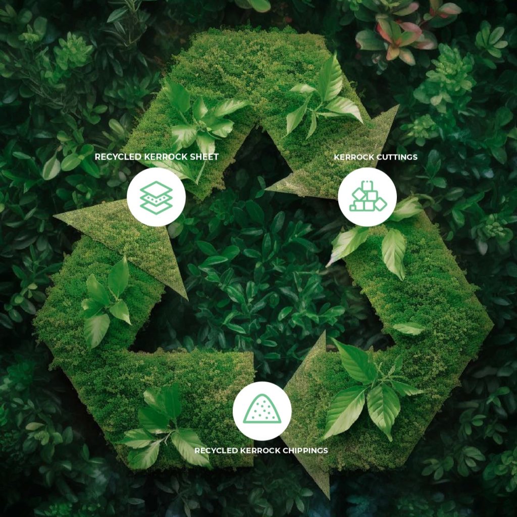 Kerrock is made with ecological responsibility in mind. Its production incorporates advanced technologies that reduce the impact on the environment. The material is recyclable and contains no harmful substances, making it safe for use indoors and in direct contact with food. It also boasts RECYCLED CONTENT certification, which certifies its sustainability.